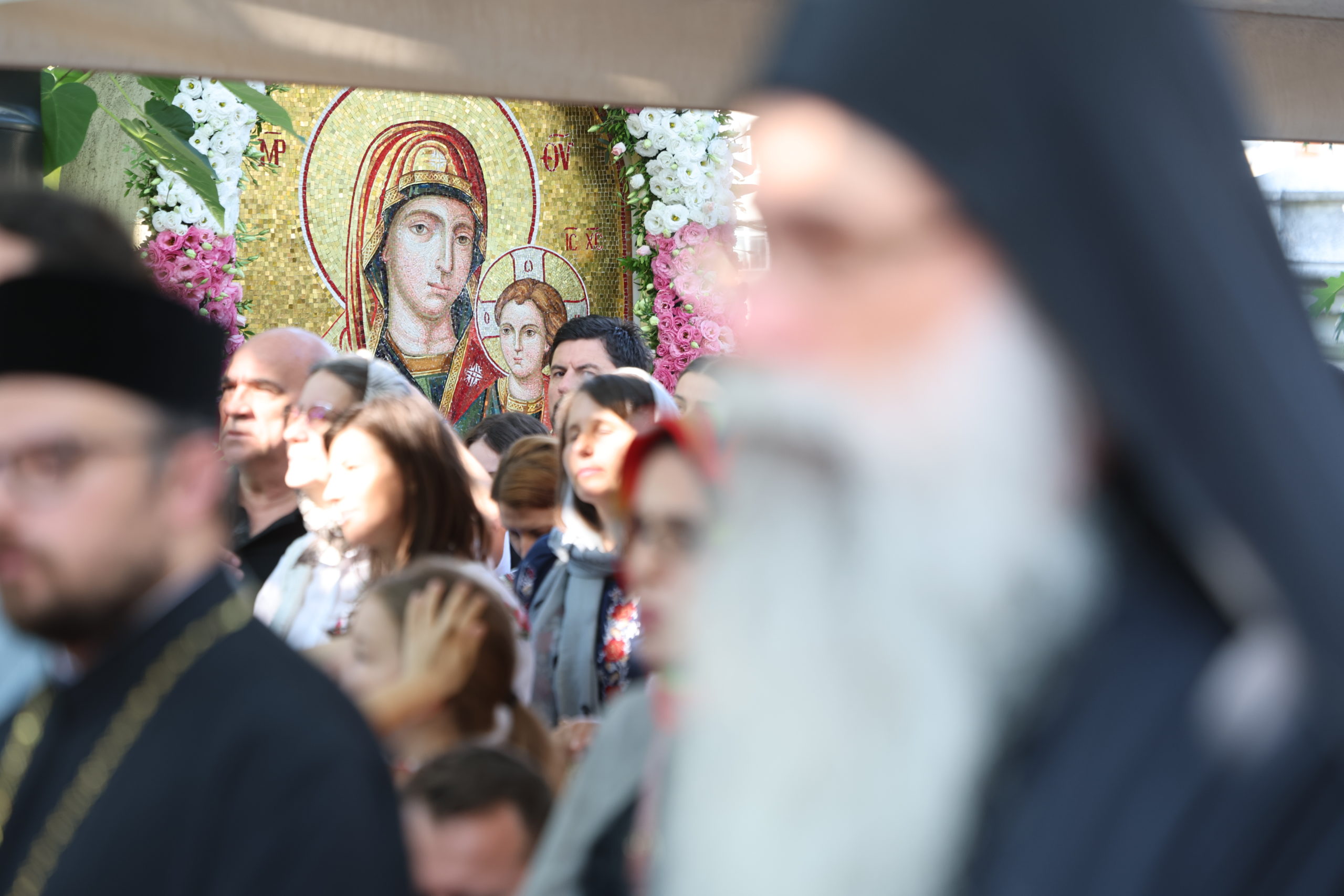 Πλήθος κόσμου έχει κατακλύσει τους δρόμους γύρω από τον Πατριαρχικό Καθεδρικό Ναό μέχρι τον προαύλιο χώρο και τον περιβάλλοντα χώρο του Παρεκκλησίου όπου συμμετείχε στην Θεία Λειτουργία, ενώ είχε τη μεγάλη ευλογία εφέτος εκτός από την εικόνας της Παναγίας και τα ιερά λείψανα που έχουν τεθεί προς προσκύνηση, να προσκυνήσει και την Τιμία Κάρα του Αγίου Ιωάννου του Χρυσοστόμου.