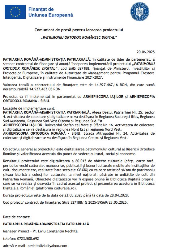 Το Πατριαρχείο Ρουμανίας ξεκίνησε ένα έργο ψηφιοποίησης της πολιτιστικής κληρονομιάς της, με στόχο να υπάρχει ηλεκτρονική πρόσβαση σε από 60.015 παλιά βιβλία, χειρόγραφα, έγγραφα και άλλα πολύτιμα αντικείμενα από τους χώρους λατρείας της χώρας, και χρονολογούνται από τον 15ο έως τον 19ο αιώνα