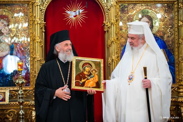 Στο τέλος της ομιλίας του, ο Αρχιεπίσκοπος δώρισε στον Πατριάρχη Δανιήλ, εκ μέρους της Ιεράς Συνόδου, μια εικόνα της Θεοτόκου κι ένα όμορφο καλάθι με λουλούδια.