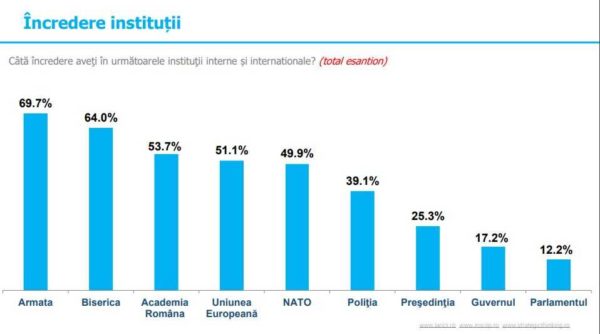 Στην πρώτη θέση, με ποσοστό 69,7%, βρίσκεται ο στρατός. Στις ακόλουθες θέσεις είναι η Ρουμανική Ακαδημία με 53,7%, ενώ το 51,1% των Ρουμάνων πολιτών δηλώνει ότι εμπιστεύεται την Ευρωπαϊκή Ένωση.