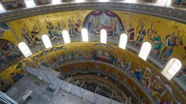Στον εσωτερικό χώρο σε εξέλιξη βρίσκονται οι εργασίες με την τοποθέτηση ψηφιδωτών για την απόδοση της σκηνής της Γέννησης κ.α. Το επόμενο διάστημα θα πραγματοποιηθούν διάφορες ηλεκτρολογικές εγκαταστάσεις πυρανίχνευσης και αερισμού.