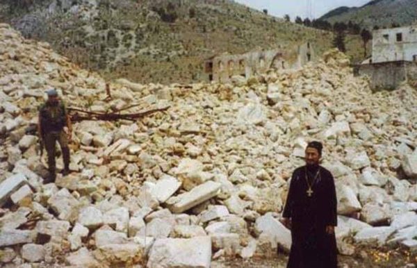 Ο επίσκοπος Αθανάσιος στα ερείπια της εκκλησίας του Καθεδρικού ναού στο Μόσταρ