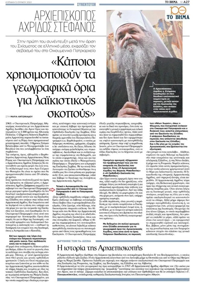 Από τη συνέντευξη του Αρχιεπισκόπου Αχρίδος κ. Στεφάνου στην δημοσιογράφο Μαρία Αντωνιάδου στο Βήμα:
