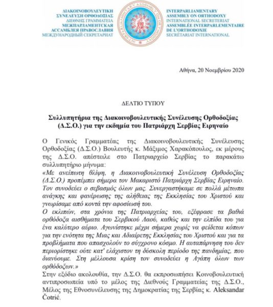Συλλυπητήριο μήνυμα απέστειλε ο Γενικός Γραμματέας της Διακοινοβουλευτικής Συνέλευσης Ορθοδοξίας (ΔΣΟ) κ. Μάξιμος Χαρακόπουλος για την εκδημία του Πατριάρχου Σερβίας κυρού Ειρηναίου στο Πατριαρχείο Σερβίας και αναφέρει μεταξύ άλλων “Ο εκλιπών στα χρόνια της Πατριαρχείας του, εξέφρασε τα βαθιά ορθόδοξα αισθήματα του Σερβικού Λαού, καθώς και την ελπίδα του για ένα καλύτερο αύριο. Αγωνίστηκε μέχρι σήμερα χωρίς να φείδεται κόπων για την ενότητα της Μίας και Αδιαίρετης Εκκλησίας του Χριστού και για τα προβλήματα που απασχολούν το σύγχρονο κόσμο”.
