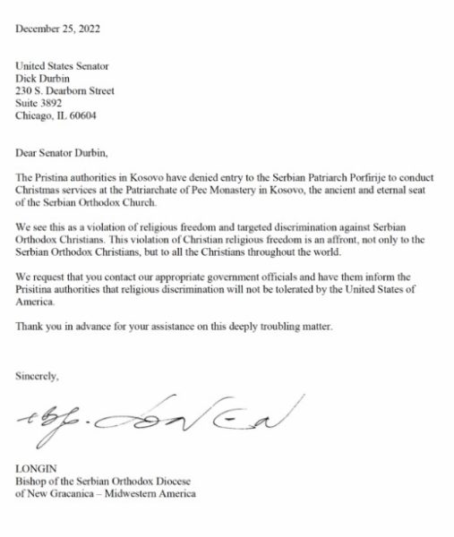 Ο Πανιερώτατος Επίσκοπος Νέας Γκρατσάνιτσας και Κεντροδυτικής Αμερικής κ. Λογγίνος έστειλε επιστολή στον Γερουσιαστή της Ομοσπονδιακής Πολιτείας του Ιλινόις, κ. Ντικ Ντάρμπιν, με την οποία τον ενημέρωσε ότι οι προσωρινές αρχές στην Πρίστινα απαγόρευσαν την είσοδο στον Μακαριώτατο Πατριάρχη Σερβίας κ.κ. Πορφύριο ο οποίος είχε προγραμματίσει να επισκεφθεί αυτές τις άγιες μέρες την Ιερά Πατριαρχική και Σταυροπηγιακή Μονή του Πετς (Πεκίου), την ιστορική πρώτη Καθέδρα του Πατριαρχείου Σερβίας, την αρχαία και αιώνια έδρα της Σερβικής Ορθόδοξης Εκκλησίας.