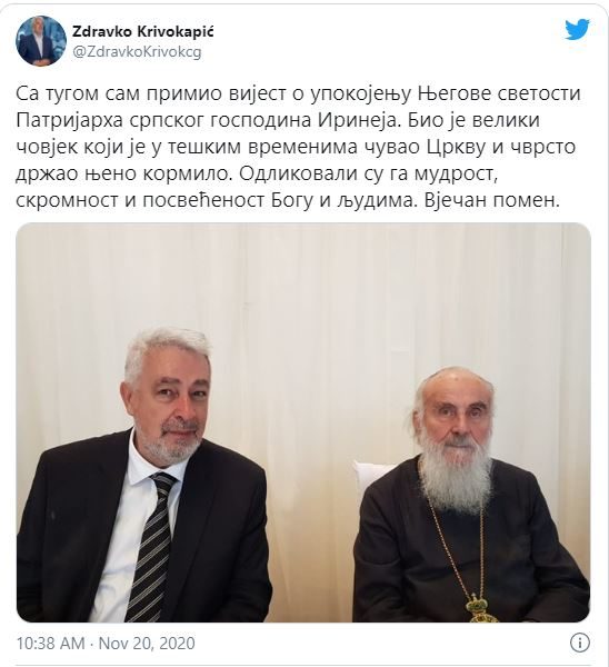 “Έλαβα με θλίψη τη είδηση για την κοίμηση της Αυτού Αγιότητας του Πατριάρχη Σερβίας Ειρηναίου. Ήταν ένας σπουδαίος άνθρωπος που φύλαγε την Σερβική Εκκλησία σε δύσκολους καιρούς και κράτησε το τιμόνι της σταθερά. Διακρίθηκε από τη σοφία, τη σεμνότητα και την αφοσίωση στον Θεό και τους ανθρώπους. Αιώνια του η μνήμη” έγραψε ο Ζντράβκο Κριβοκάπιτς πολιτικός ηγέτης του Μαυροβουνίου στην ανάρτησή του στο twitter.