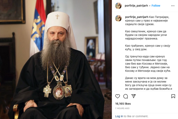 «Ο Μακαριώτατος Πατριάρχης Σερβίας κ.κ. Πορφύριος, ο οποίος σύμφωνα με το κανονικό πρόγραμμα επρόκειτο να φτάσει στην Καθέδρα της Ορθοδόξου Εκκλησίας της Σερβίας, στην Πατριαρχική Μονή του Πετς, ακινητοποιήθηκε από τις αρχές στην Πρίστινα στη συνοριακή διάβαση του Μέρνταρε όπου του ανέφεραν ότι απαγορεύεται να εισέλθει στην Επαρχία.