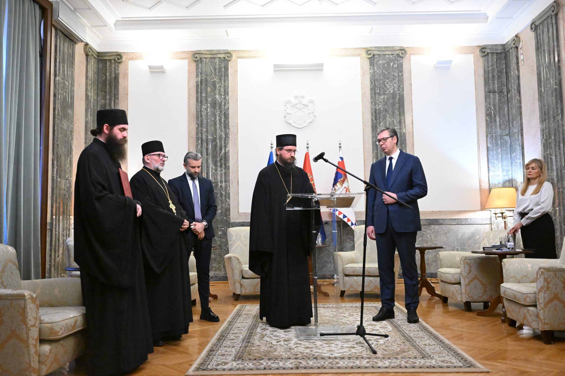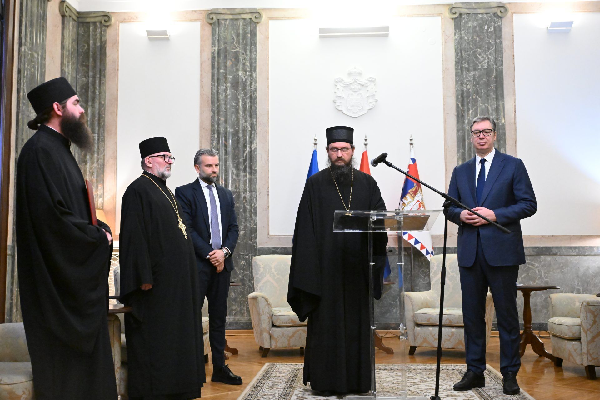 Μετά την τελετή απονομής του ύψιστου παρασήμου της Επισκοπής στην Προεδρία της Δημοκρατίας της Σερβίας στο Βελιγράδι, ο Επίσκοπος κ. Σέργιος εκφώνησε ομιλία στην οποία ευχαρίστησε τον Αλεξάνταρ Βούτσιτς για την κατανόηση που επέδειξε και τη βοήθεια που παρείχε στην Επισκοπή.