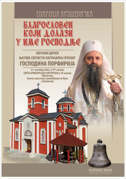 Ο Μακαριώτατος Πατριάρχης Σερβίας κ.κ. Πορφύριος τη Δευτέρα, 31 Οκτωβρίου 2022, θα επισκεφθεί την Επισκοπή Κρούσεβατς και τη Μονή του Αγίου Αποστόλου και Ευαγγελιστή Λουκά στη Βοσνία.