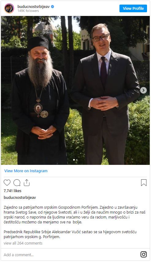 Αναφερόμενος στην συνάντηση μέσω ανάρτησης του σε μέσο κοινωνικής δικτύωσης, ο Προκαθήμενος της Εκκλησίας της Σερβίας, μεταξύ άλλων, σημείωσε χαρακτηριστικά: “Σήμερα, στην Πατριαρχική Κατοικία υποδέχτηκα τον Πρόεδρο της Σερβίας κ. Αλεξάνταρ Βούτσιτς. Συζητήσαμε για την συνδρομή του Κράτους στην ολοκλήρωση της εκκλησίας του Αγίου Σάββα και άλλα σημαντικά έργα”.