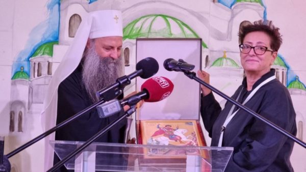 Ο Πατριάρχης δώρισε στη διευθύντρια του σχολείου κ. Jovanka Lastić και στους μαθητές του σερβικού σχολείου μια εικόνα του Αγίου Μεγαλομάρτυρα Γεωργίου. Από τη πλευρά της η διευθύντρια επέδωσε στον κ.κ. Πορφύριο μια εικόνα την οποία ζωγράφισαν οι μαθητές του σχολείου.