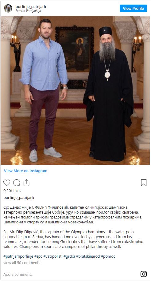 Σε μια αξιέπαινη κίνηση ανθρωπιάς, αλληλεγγύης και στήριξης των πυρόπληκτων στην Ελλάδα προέβη ο αρχηγός της Εθνικής ομάδας υδατοσφαίρισης της Σερβίας και χρυσός Ολυμπιονίκης στους πρόσφατους Αγώνες του Τόκιο Φίλιπ Φιλίποβιτς, στο πλαίσιο της συνάντησης που είχε με τον Μακαριώτατο Πατριάρχη Σερβίας κ.κ. Πορφύριο στην έδρα του Πατριαρχείου στο Βελιγράδι, την Παρασκευή 20 Αυγούστου 2021.