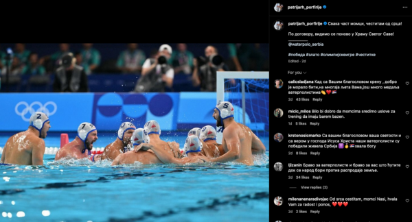 «Μπράβο παιδιά, συγχαρητήρια μέσα από την καρδιά μου! Κατόπιν συμφωνίας θα σας ξαναδούμε στην εκκλησία του Αγίου Σάββα!», ανέφερε το συγχαρητήριο μήνυμα που ανήρτησε ο Πατριάρχης κ.κ. Πορφύριος σε μέσο κοινωνικής δικτύωσης αμέσως μετά την κατάκτηση του χρυσού Ολυμπιακού μεταλλίου από την Σερβία.