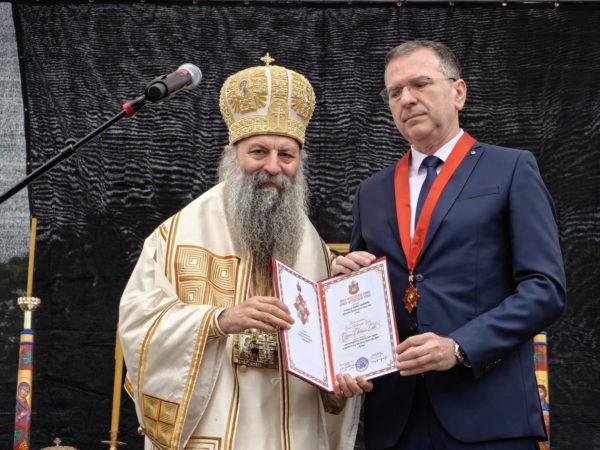 Στο τέλος της Θείας Λειτουργίας ο Πατριάρχης Σερβίας κ.κ. Πορφύριος επέδωσε την τιμητική διάκριση του “Τάγματος του Αγίου Σάββα”, δεύτερου βαθμού, στον κ. Milenko Jovanović, πρόεδρος του Εκκλησιαστικού Συμβουλίου του Αγίου Σάββα στη Βιέννη, ως ένδειξη ευγνωμοσύνης για την ανιδιοτελή βοήθεια, υποστήριξη και φιλανθρωπία που προσφέρει στη Σερβική Ορθόδοξη Εκκλησία στην Αυστρία.