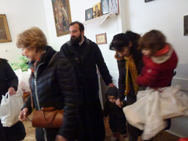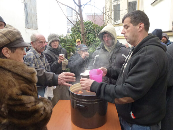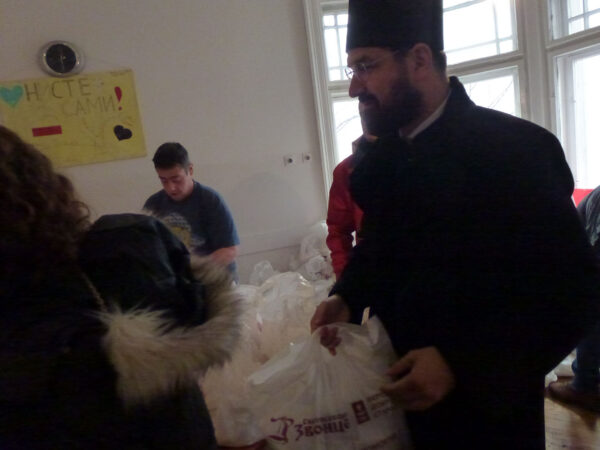 Με το αμοιβαίο συγχαρητήριο μήνυμα των Χριστουγέννων και με τον χαρούμενο χαιρετισμό “Η ειρήνη του Θεού, ο Χριστός γεννιέται – γεννήθηκε από το Θεό!”, εμπερίστατοι άνθρωποι σερβίρονται αρχικά στην αυλή της εκκλησίας. Ο διάκονος Μπράνισλαβ Γιόσιτς, με την ψαλμωδία του εορταστικού τροπαρίου, τη Γέννησή σας, τον Χριστό, τον Θεό μας, διακόσμησε τους χώρους και προσήλκυσε τους πολίτες. Στη συνέχεια παρέδωσαν τα πακέτα και αντήλλαξαν χαιρετισμούς για τα Χριστούγεννα.