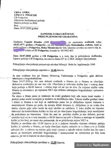 Η Θεία Λειτουργία βιντεοσκοπήθηκε χωρίς γραπτό ένταλμα, ενώ μετά το τέλος της η αστυνομία πήρε τα στοιχεία των πιστών και έδωσε κλήτευση στον Ιερέα Μπράνκο Βούγιασιτς να παραστεί στα κεντρικά της Ασφάλειας.