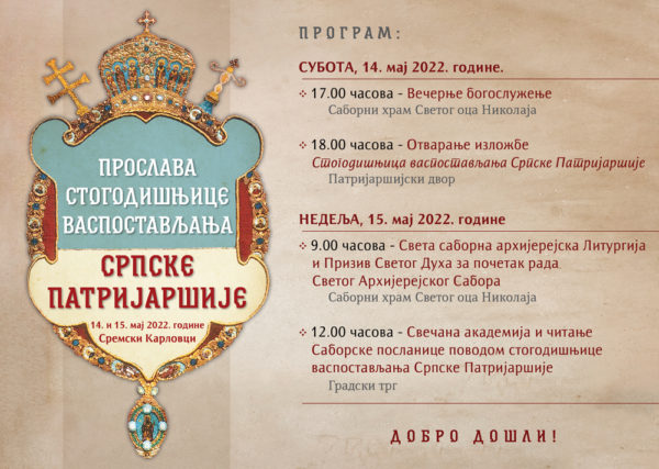 Ο εορτασμός του μεγάλου εκκλησιαστικού-ιστορικού ιωβηλαίου θα αρχίσει το Σάββατο 14 Μαΐου 2022, στον Καθεδρικό Ναό του Αγίου Νικολάου, με την πανηγυρική υποδοχή του Μακαριωτάτου Πατριάρχη Σερβίας κ.κ. Πορφύριου και ακολούθως την τέλεση Εσπερινού στις 5 το απόγευμα. Στη συνέχεια, ο Μακαριώτατος θα εγκαινιάσει έκθεση πολυμέσων με τίτλο «Ένας αιώνας από την ίδρυση του Σερβικού Πατριαρχείου 1920-2020» στο περίφημο Πατριαρχικό Μέγαρο Sremski Karlovci.