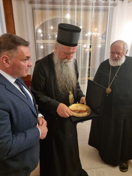 Ανταποδίδοντας την τιμή που έγινε στο πρόσωπό του ο Μητροπολίτης Μαυροβουνίου δώρισε στον δήμαρχο έναν αναμνηστικό με τον “Δίσκο της Ποτγκόριτσα”.