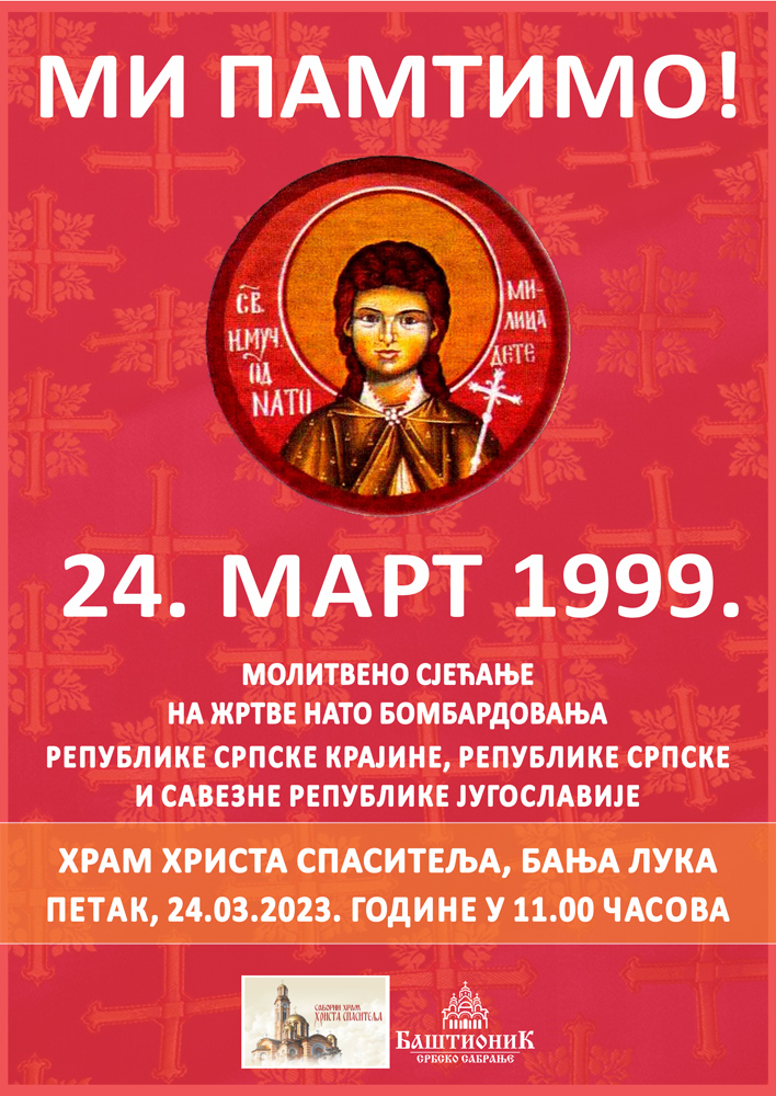 Με αφορμή την 24η επέτειο από τον βομβαρδισμό της Ομοσπονδιακής Δημοκρατίας της Γιουγκοσλαβίας από το ΝΑΤΟ, η εν Σερβία Ορθόδοξη Εκκλησία ανακοίνωσε ότι θα τελεστεί μνημόσυνο σε όλους τους Ιερούς Ναούς, όπως άλλωστε γίνεται κάθε χρόνο, για τα θύματα της 24ης Μαρτίου του 1999.