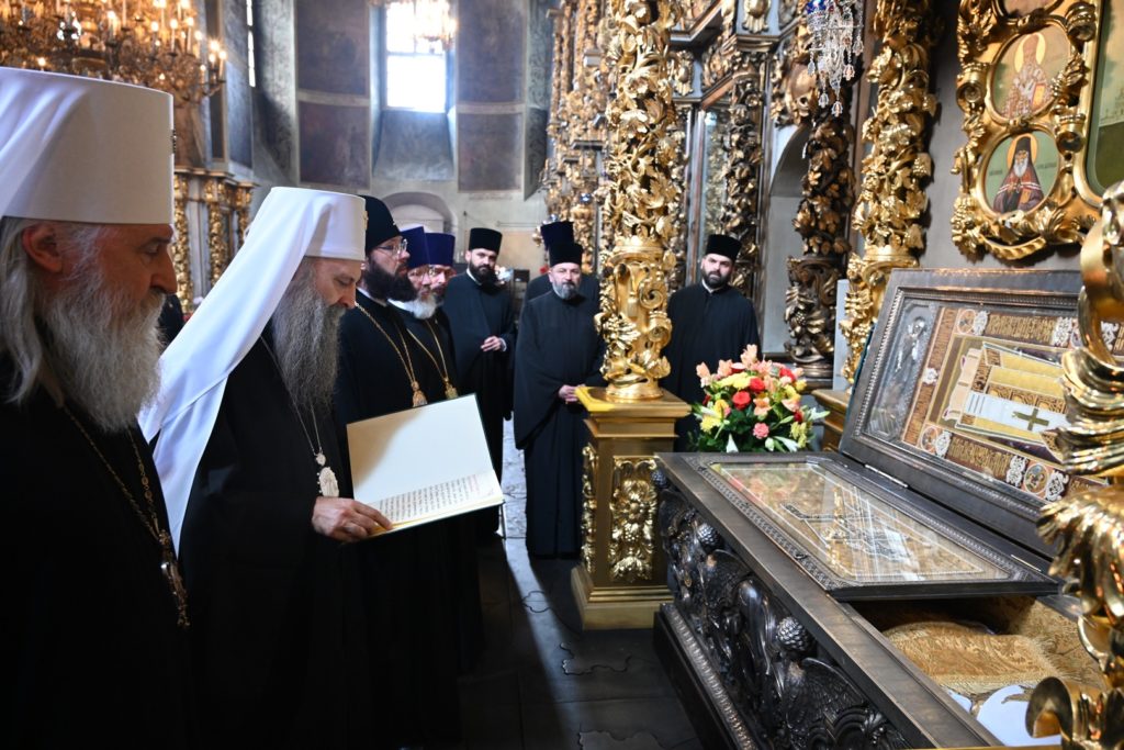 Ο Πατριάρχης κ.κ. Πορφύριος αφού ενημερώθηκε από τον Ηγούμενο της Μονής, Μητροπολίτη Κασίρας κ. Θεόγνωστο για την ιστορία του μοναστικού συγκροτήματος προσκύνησε στη συνέχεια την ιερή λάρνακα του Αγίου Τύχωνα, Πατριάρχη Μόσχας.
