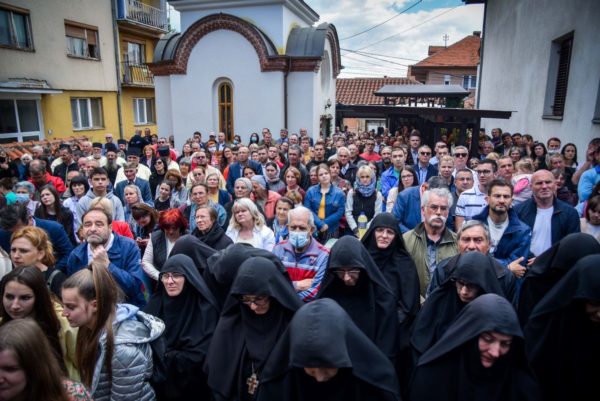 Μετά τη Θεία Λειτουργία ακολούθησε λιτάνευση της ιεράς εικόνας του Αγίου Ιουστίνου Πόποβιτς στους δρόμους της πόλης.