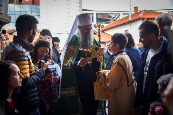 Τον Μακαριώτατο υποδέχθηκε στην είσοδο του Καθεδρικού Ναού ο Επίσκοπος Βράνιε κ. Παχώμιος μαζί με κληρικούς και πλήθος πιστών.