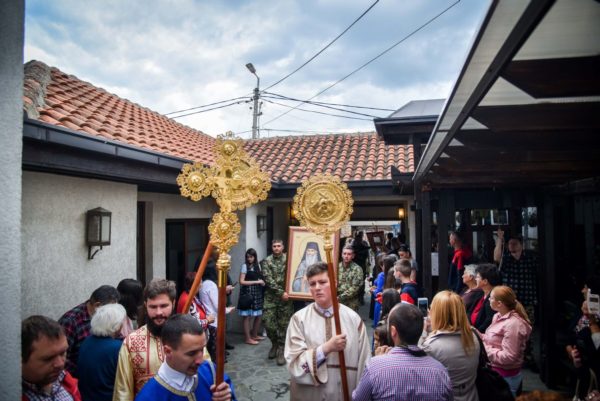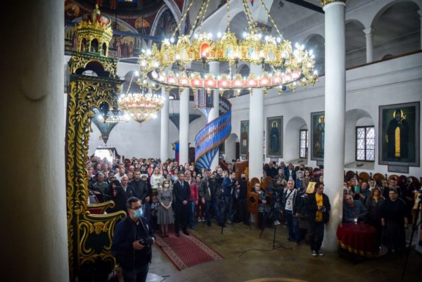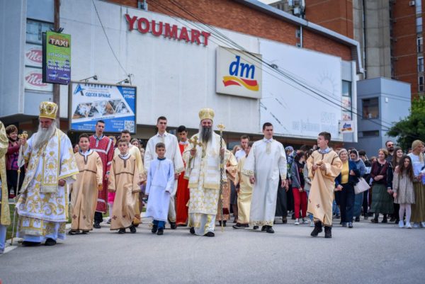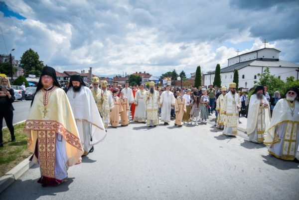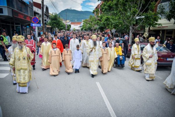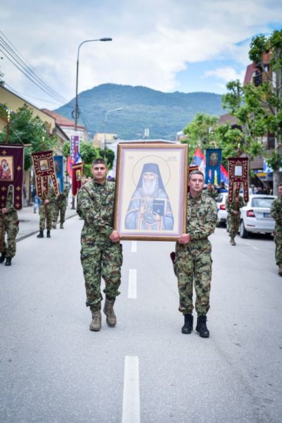 Μετά τη Θεία Λειτουργία ακολούθησε λιτάνευση της ιεράς εικόνας του Αγίου Ιουστίνου Πόποβιτς στους δρόμους της πόλης.