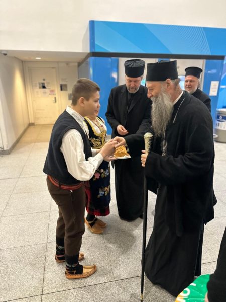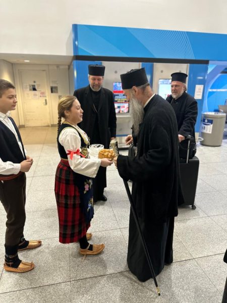 Ο Μακαριώτατος και η συνοδεία του έτυχαν θερμής υποδοχής στο αεροδρόμιο από τον προϊστάμενο του Ιερού Ναού του Αγίου Σάββα στο Μανχάταν πρωθιερέα-σταυροφόρο, Δρ. Ζίβογιν Γιακόβλεβιτς, καθώς και παιδιά ντυμένα με παραδοσιακές φορεσιές.