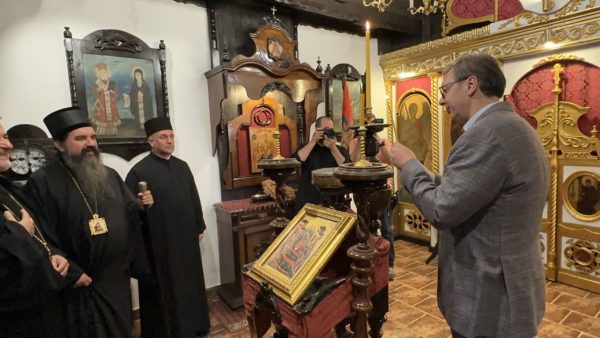 Ο Πανιερώτατος ξενάγησε τον Σέρβο Πρόεδρο στην εκκλησία της Κοιμήσεως της Θεοτόκου ενώ τον ενημέρωσε επίσης για τα εκκλησιαστικά κειμήλια και τα μουσειακά εκθέματα  τα οποία βρίσκονται στο συγκρότημα.