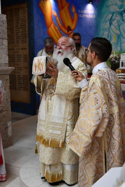 Της Θείας Λειτουργίας προέστη ο Σεβασμιώτατος Μητροπολίτης Δαμπροβοσνίας κ. Χρυσόστομος, που συλλειτούργησε με τον Σεβασμιώτατο Μητροπολίτη Μαυροβουνίου και Παραθαλασσίας κ. Ιωαννίκιο, τον Πανιερώτατο Επίσκοπο Ντύσελντορφ και Γερμανίας κ. Γρηγόριο, τον Πανιερώτατο Επίσκοπο Βουδίμλιε και Νίκσιτς κ. Μεθόδιο, τον Πανιερώτατο Επίσκοπο Ζαχουμίου και Ερζεγοβίνης κ. Δημήτριο και τον Θεοφιλέστατο Επίσκοπο Hum (Χουμ) κ. Ιωάννη.