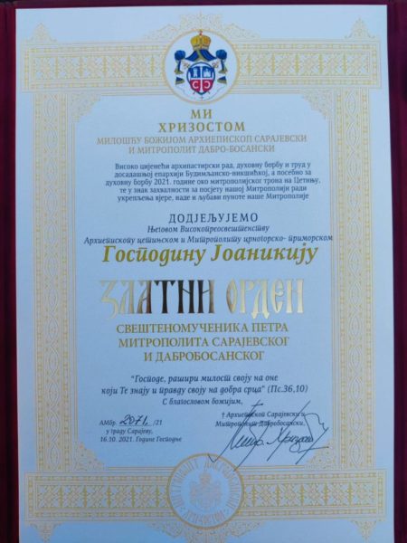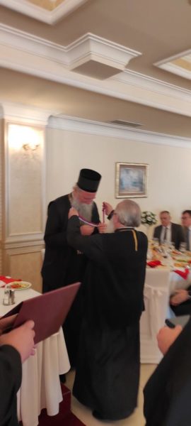 Θέλοντας να ευχαριστήσει τον ποιμενάρχη της ιστορικής Μητρόπολης του Μαυροβουνίου για την παρουσία του στις εορταστικές εκδηλώσεις, που στόχο είχαν να ενισχύουν την πίστη, την ελπίδα και την αγάπη, ο Μητροπολίτης κ. Χρυσόστομος του απένειμε το χρυσό παράσημο του Τάγματος του Αγίου Πέτρου το οποίο αποτελεί τη μεγαλύτερη διάκριση της τοπικής Εκκλησίας.