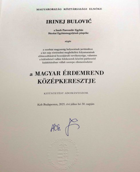 Με τον μεσαίο σταυρό του Τάγματος της Αξίας της Ουγγρικής Δημοκρατίας βραβεύτηκε σε ειδική τελετή που πραγματοποιήθηκε την Τρίτη 28 Σεπτεμβρίου στην έδρα του Πατριαρχείου Σερβίας στο Βελιγράδι, ο Επίσκοπος Μπάτσκας κ. Ειρηναίος.