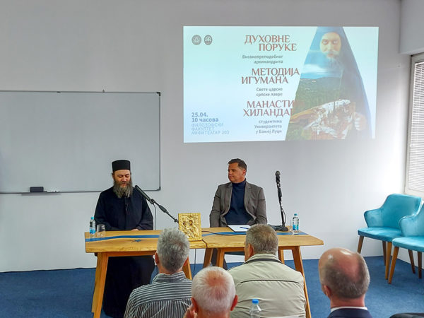 Στις 25 Απριλίου ο Γέροντας Μεθόδιος επισκέφθηκε τη Φιλοσοφική Σχολή του Πανεπιστημίου της Μπάνια Λούκα όπου πραγματοποίησε διάλεξη κατά την οποία οι φοιτητές παρακολούθησαν με ενδιαφέρον την πνευματική ομιλία του Γέροντα ο οποίος απάντησε στη συνέχεια σε σειρά ερωτήσεων που υπέβαλαν φοιτητές και φοιτήτριες.