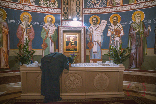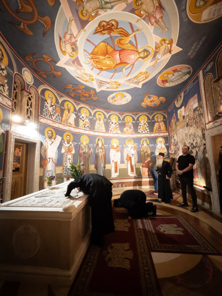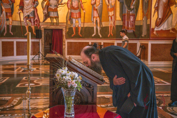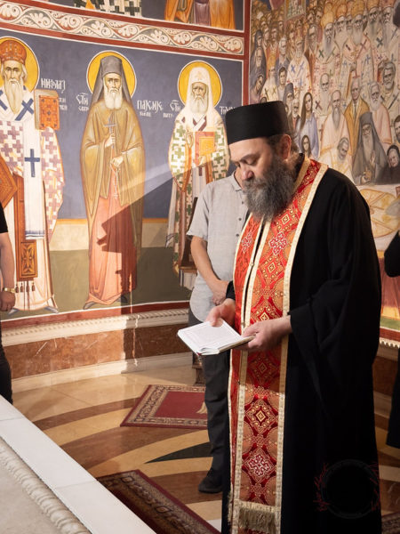 Στη συνέχεια, ο Αρχιμανδρίτης Μεθόδιος τέλεσε Τρισάγιο στον τάφο του Μακαριστού Μητροπολίτη Μαυροβουνίου κυρού Αμφιλοχίου στον τόπο ανάπαυσής του στην κρύπτη του Ναού – στο παρεκκλήσιο του Αγίου Αμφιλοχίου επισκόπου Ικονίου, από τον οποίο πήρε το μοναστηριακό του όνομα ο μακαριστός Μητροπολίτης.