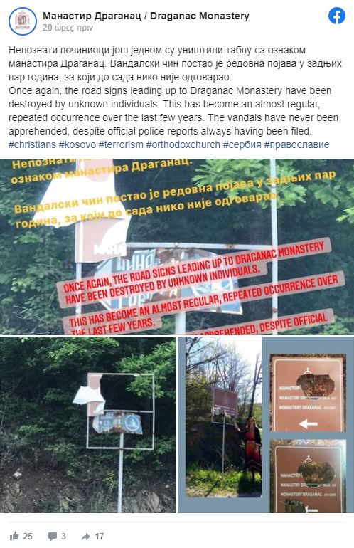 “Για άλλη μια φορά, οι πινακίδες που οδηγούν στη Μονή Ντραγκάνατς έχουν καταστραφεί από αγνώστους. Αυτό έχει εξελιχθεί σε ένα σχεδόν τακτικό και επαναλαμβανόμενο γεγονός τα τελευταία χρόνια. Οι βάνδαλοι δεν συνελήφθησαν ποτέ, παρά τις επίσημες αναφορές που έχουν κατατεθεί στην αστυνομία”, επισημαίνει η Μονή με χθεσινό μήνυμα της (29/5) σε μέσο κοινωνικής δικτύωσης, αναρτώντας παράλληλα και φωτογραφίες από τους βανδαλισμούς.