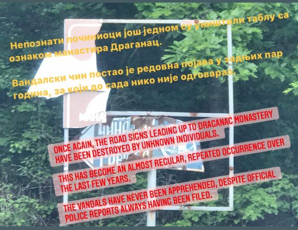 Σε έξαρση είναι τα περιστατικά βανδαλισμών και βεβηλώσεων εις βάρος των Ορθοδόξων μοναστηριών στο Κοσσυφοπέδιο. Το πιο πρόσφατο περιστατικό σημειώθηκε κοντά στην Ιερά Μονή Ντραγκάνατς που είναι αφιερωμένη στους Αγίους Αρχαγγέλους Μιχαήλ και Γαβριήλ, στον δήμο Νόβο Μπρντο, όπου άγνωστοι έσπασαν τις πινακίδες στον δρόμο που οδηγεί προς την Μονή.