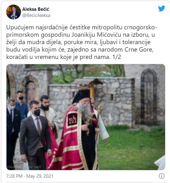 Στον νέο Μητροπολίτη ευχήθηκε και ο Πρόεδρος της Βουλής του Μαυροβουνίου κ. Αλέξα Μπέσιτς ο οποίος σημείωσε “Είμαι πεποισμένος ότι η Μητρόπολη Μαυροβουνίου και οι πιστοί έχουν δεχτεί έναν άξιο Ποιμενάρχη. Εκφράζω τα συγχαρητήριά μου στον Μητροπολίτη Μαυροβουνίου κ. Ιωαννίκιο για την εκλογή του και του εύχομαι να τον οδηγούν σοφές πράξεις, μηνύματα αγάπης, ειρήνης και ανοχής και μαζί με τον λαό του Μαυροβουνίου να οδηγηθούμε μπροστά” έγραψε σε ανάρτησή του.