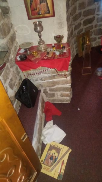 “Ήρθα αμέσως στην εκκλησία και με την πρώτη ματιά μου φάνηκε ότι δεν είχε γίνει τίποτα. Ωστόσο, όταν κοίταξα πιο προσεκτικά, παρατήρησα ότι η κλειδαριά και το λουκέτο είχαν παραβιαστεί. Μπήκα στην εκκλησία και βρήκα ένα αναποδογυρισμένο ντουλάπι στο οποίο υπήρχαν κεριά, βιβλία, στέφανα, ένα λειτουργικό σκεύος για τον αγιασμό και άλλα βοηθητικά σκεύη για τη λατρεία. Οι πόρτες ήταν ανοιχτές, ενώ είχαν αφαιρέσει τα τάματα από τις εικόνες και τα είχαν πετάξει στο πάτωμα. Το Ευαγγέλιο άνοιξε και σκίστηκε σε ένα μέρος ενώ ζημιές προκλήθηκαν και στην αγία τράπεζα”, δήλωσε.
