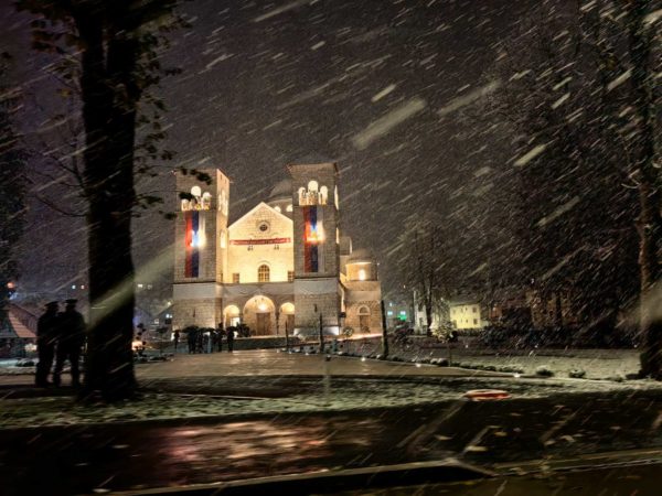 Κατά την διάρκεια της τέλεσης της Δοξολογίας οι νιφάδες χιονιού που έπεφταν στην Φότσα έντυσαν στα λευκά το ναό του Αγίου Σάββα.