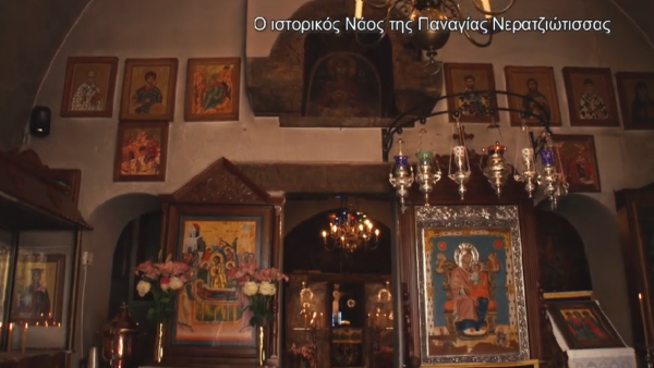 Επίσης, μπορείτε να παρακολουθήσετε το αφιέρωμα στο ιερό Μητροπολιτικό παρεκκλήσιο της Παναγίας Νεραντζιώτισσας, που βρίσκεται στα ριζά του λόφου του Πέλικα στο Μαρούσι. Το ιστορικό αυτό εκκλησάκι πανηγυρίζει την 8η Σεπτεμβρίου, εορτή του Γενεθλίου της Θεοτόκου. Πιθανώς ονομάστηκε Νεραντζιώτισσα λόγω της καλλιέργειας νεραντζιών στη γύρω περιοχή. Χτίστηκε το έτος 1578. Στον κυρίως ναό και το ιερό βήμα σώζεται μέρος του τοιχογραφικού διάκοσμου του 18ου αιώνα, έργο δύο αγιογράφων. Ο μεταγενέστερος νάρθηκας δεν φέρει ίχνη τοιχογραφιών παρά μόνο την παράσταση της Θεοτόκου “ΟΔΗΓΗΤΡΙΑΣ” στη μικρή κόγχη του υπέρθυρου.