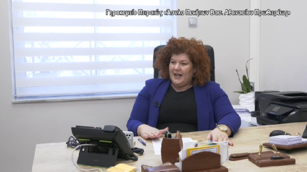 Η Ευαγγελία Κονταξή, Γενική Διευθύντρια του Γηροκομείου, μιλά για την ιστορία και την προσφορά του ιδρύματος στους ηλικιωμένους του Πειραιά.