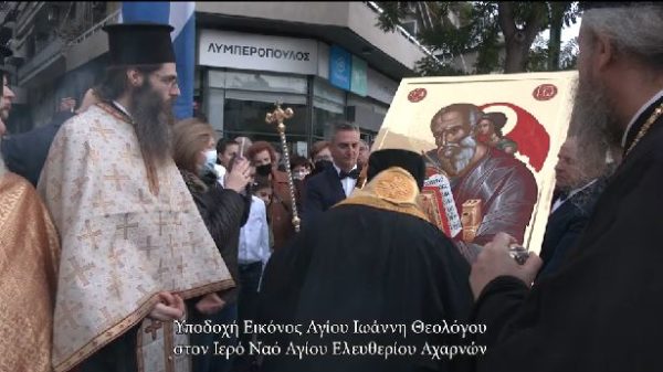 *Στις 17.40 την Υποδοχή της Εικόνας του Αγίου Ιωάννου του Θεολόγου στον Άγιο Ελευθέριο. Με ευλάβεια και κατάνυξη υποδέχτηκαν την Κυριακή 4 Δεκεμβρίου 2022 ιερός κλήρος και πιστοί, τη νέα Βυζαντινή Εικόνα εκ παλαιού πρωτοτύπου, του Αγίου Ιωάννη του Θεολόγου και Ευαγγελιστού, στον Ιερό Ενοριακό Ναό του Αγίου Ελευθερίου οδού Αχαρνών – Αθηνών.