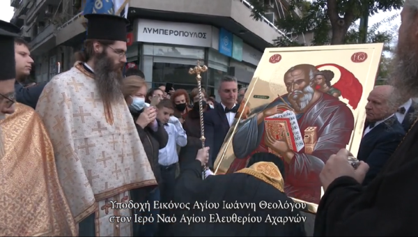 Με ευλάβεια και κατάνυξη υποδέχτηκε το απόγευμα της Κυριακής 4 Δεκεμβρίου 2022 ιερός κλήρος και πιστοί, τη νέα Βυζαντινή Εικόνα εκ παλαιού πρωτοτύπου, του Αγίου Ιωάννη του Θεολόγου και Ευαγγελιστού, στον Ιερό Ενοριακό Ναό του Αγίου Ελευθερίου οδού Αχαρνών – Αθηνών. Η υποδοχή πραγματοποιήθηκε στο πλαίσιο των εκδηλώσεων “Εόρτια 2022” του Ιερού Ναού.