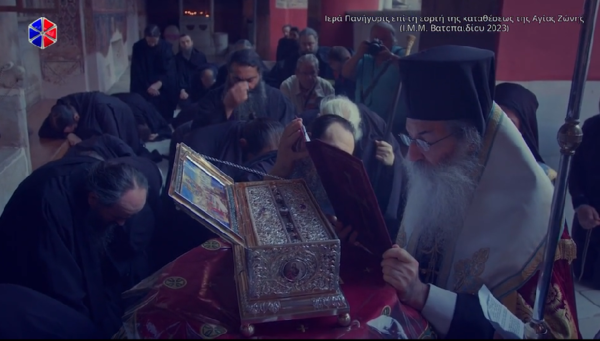 Η εορτή της καταθέσεως της Τιμίας Ζώνης της Θεοτόκου στην Ι.Μ.Μ. Βατοπαιδίου, όπου φυλάσσεται το μοναδικό θεομητορικό κειμήλιο από την επίγεια ζωή της Παναγίας. Της ιεράς Πανηγύρεως προέστη ο Σεβασμιώτατος Μητρ. Πειραιώς κ. Σεραφείμ. Το πρωί της κυριωνύμου ημέρας, τελέσθηκε η ακολουθία του Αγιασμού στη φιάλη της Μονής και ακολούθησε η λιτάνευση της Αγίας Ζώνης πέριξ της Μονής. Εν συνέχεια τελέσθηκε Πανηγυρική και Αρχιερατική Θεία Λειτουργία προεξάρχοντος του Μητρ. Πειραιώς κου Σεραφείμ.