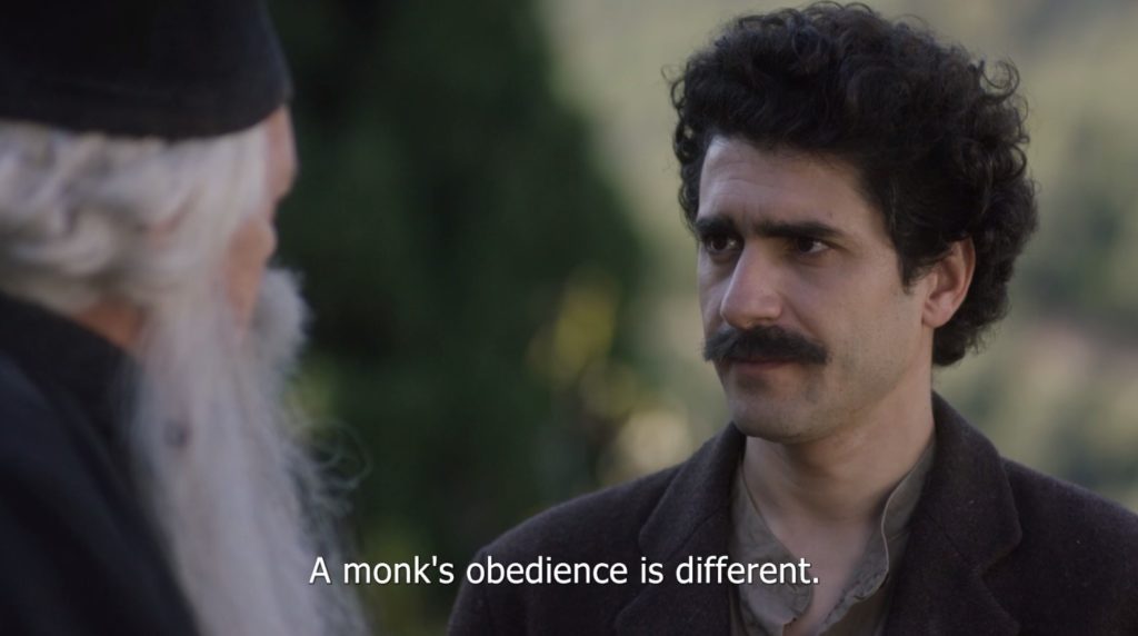 At great risk to his life, Arsenios saves a fellow soldier who was wounded in battle. Everyone is amazed and tries to understand how he was not hit by gunfire in his attempt to carry the wounded soldier. When Arsenios is discharged from the army and returns home, his mother’s joy will not last long. The next day Arsenios leaves for Mount Athos. When he arrives at the “Orchard of the Virgin Mary”, he takes refuge with Father Kyrillos, a great spiritual man, who gives him his first advice on monasticism. Shortly after, he receives a letter from his father, who asks him to return and help him in the fields and also prepare the dowry for his little sister, Christina. Arsenios is in a dilemma and seeks guidance from Father Kyrillos, who tells him that it is better to go to his parents’ house, take care of his obligations, and then return for good. “Otherwise, temptation will be constantly planting thoughts, it will create qualms in your mind, and this will never end. It will not let you concentrate on your monastic duties. Go back, help your family, but do it with love…”, Father Kyrillos, tells him.