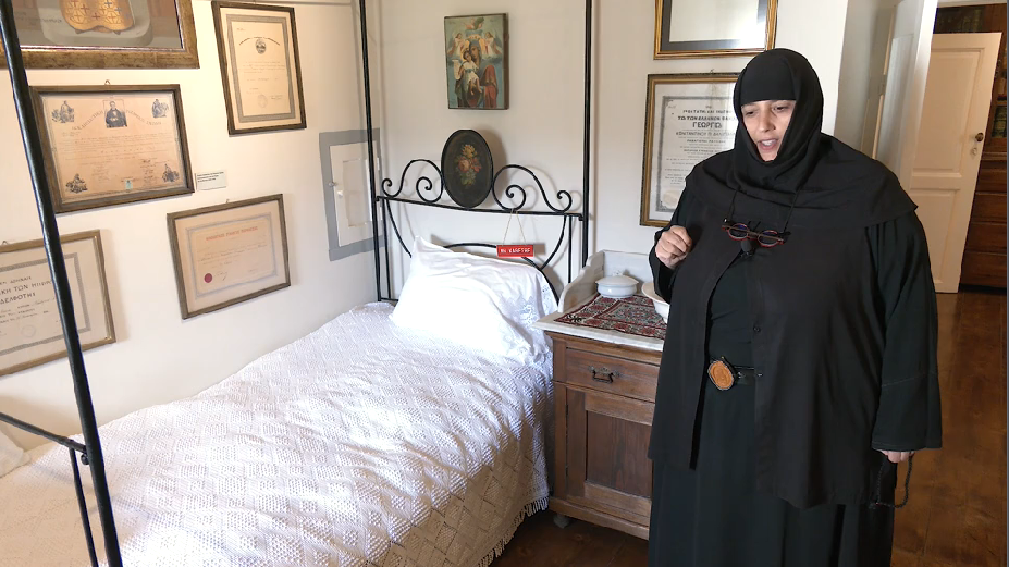Η Γερόντισσα Τιμοθέη, Καθηγουμένη του Ιερού Ησυχαστηρίου, μας ξεναγεί στον Ιερό Ναό της Αγίας Τριάδος όπου και φυλάσσονται η Αγία Κάρα και τα Λείψανα του Αγίου Νεκταρίου, στον Τάφο του, στο κελάκι του όπου και έχουν τοποθετηθεί προσωπικά αντικείμενα καθώς και τα Αμφιά του.