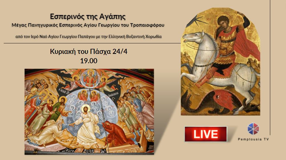 Παρακολουθήστε την Ακολουθία του Εσπερινού της Αγάπης και τον Μέγα Πανηγυρικό Εσπερινό του Αγίου Γεωργίου του Τροπαιοφόρου από τον Ιερό Ναό Αγίου Γεωργίου Παπάγου σε απευθείας μετάδοση από την διαδικτυακή τηλεόραση της ΠΕΜΠΤΟΥΣΙΑΣ: