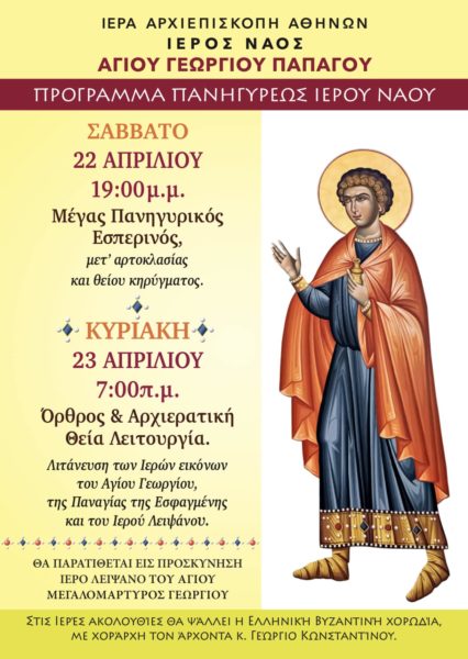 Παρακολουθήστε σήμερα, Σάββατο 22 Απριλίου 2023, στις 7:00 μ.μ. σε απευθείας μετάδοση από τη διαδικτυακή τηλεόραση της Pemptousia TV τον Μέγα Πανηγυρικό Εσπερινό της εορτής του Αγίου Γεωργίου από τον φερώνυμο πανηγυρίζοντα Ιερό Ναό του Παπάγου.