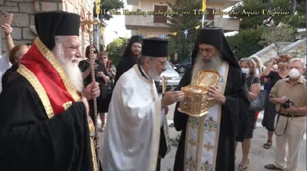 Ο Ιερός Ναός Αγίας Μεγαλομάρτυρος Παρασκευής και Οσίας Παρασκευής της Επιβατηνής Νέας Πεντέλης υποδέχθηκε τη Τιμία Κάρα του Αγίου Μεγαλομάρτυρος Γεωργίου του Τροπαιοφόρου από την Ιερά Μονή Ξενοφώντος Αγίου Όρους όπου αποθησαυρίζεται.