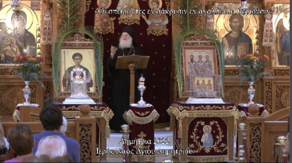 Με την παράκληση των τριών Ιεραρχών και του Μεγαλόμαρτυρος Δημητρίου του Μυροβλύτου ξεκίνησαν οι απογευματινές εορταστικές εκδηλώσεις «ΔΗΜΗΤΡΙΑ 2022», στον Ιερό Ναό Αγίου Δημητρίου, του ομώνυμου Δήμου Αττικής, την Κυριακή 2/10/2022. Στη συνέχεια, ομιλητής ήταν ο Γέροντας Εφραίμ, καθηγούμενος της Ιεράς Μεγίστης Μονής Βατοπαιδίου, ο οποίος ανέπτυξε το θέμα: «Οι σπείροντες εν δάκρυσιν εν αγαλλιάσει θεριούσιν» (Ψαλμ. 125,5).